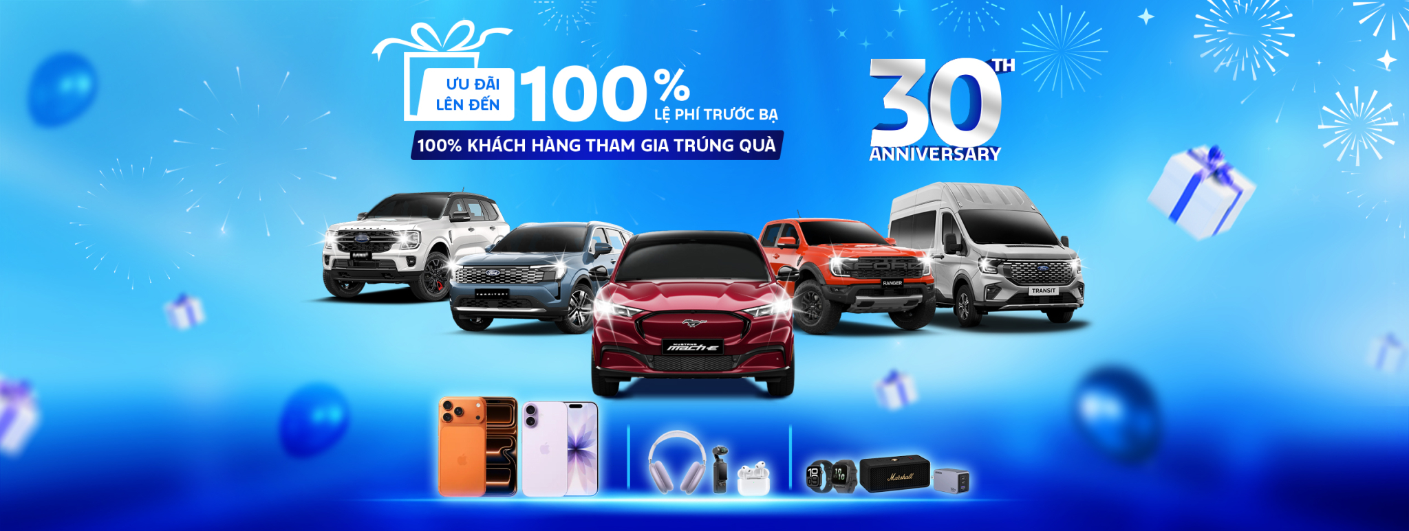 “Đại Tiệc Sinh Nhật Ford 30 Năm – Ưu Đãi 100% Lệ Phí Trước Bạ” là chương trình tri ân quy mô lớn nhất trong năm, mang đến hàng loạt lợi ích thiết thực và quà tặng hấp dẫn dành cho khách hàng.