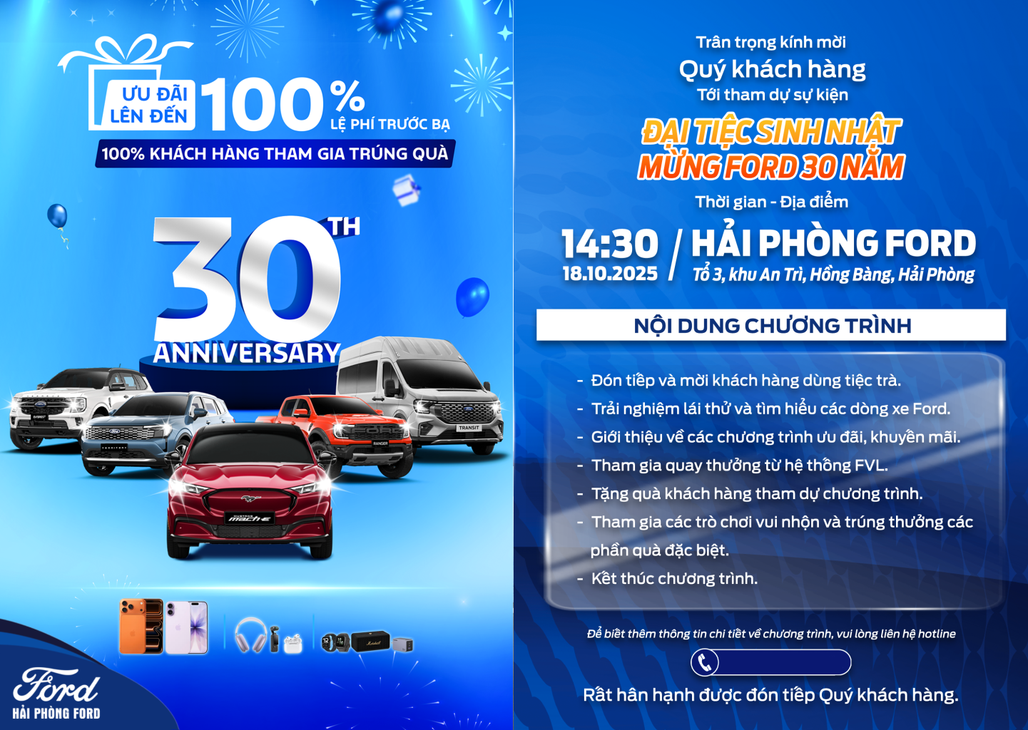 Hải Phòng Ford trân trọng gửi thư mời Quý khách hàng tham dự Đại Tiệc Sinh Nhật Ford 30 Năm ngày 18/10/2025 – sự kiện tri ân đặc biệt với ưu đãi 100% lệ phí trước bạ và quà tặng giá trị.